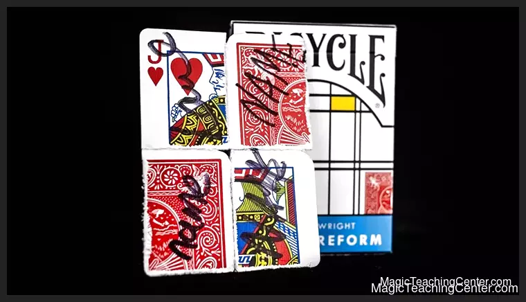 Watch as any court card is cleanly and openly torn into four quarters with no palming or hidden moves. The spectator then shuffles and rotates the pieces to mix them up. Two pieces are signed on the face and two on the back, leading to a mesmerizing restoration that displays all four signatures on a single card side, with two pieces reversed and two face-forward.