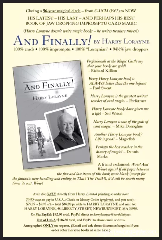 Cost will be: Check or Postal Money Order – $79.95 + $9.95 = $89.90. Payable to Harry Lorayne, and mail to: HARRY LORAYNE, 48 LIBERTY STREET, NEWBURYPORT, MA 01950. Or via PayPal: $92.90 total – can PayPal directly to [email protected].