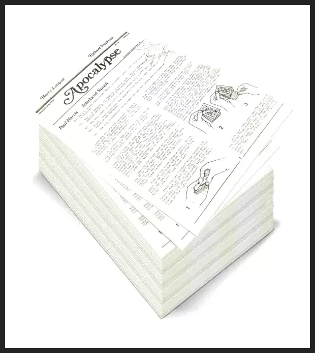 Harry Lorayne’s Apocalypse was one of magic’s most exciting periodicals. Published from 1978 to 1997, it featured fresh sleight-of-hand magic from legendary magicians like: Fred Braue, Bro. John Hamman, Slydini, Frank Garcia, Herb Zarrow, Eddie Fechter, Alex Elmsley, Henry Christ, Sol Stone, Ken Krenzel, Howard Schwarzman, Sid Lorraine, Martin Gardner, Martin Nash, Ed Marlo, and Dai Vernon. It also included some of the first published effects from then up and coming performers like: David Roth, Richard Vollmer, Geoff Latta, Derek Dingle, Paul Harris, John Cornelius, Darwin Ortiz, Roger Klause, Richard Kaufman, Jon Racherbaumer, Paul Gertner, Michael Ammar, Jeff McBride, Tom Mullica, and Larry Jennings.