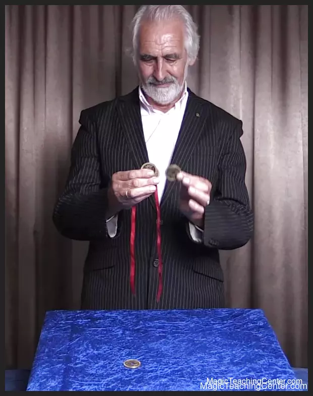 A purely sleight of hand routine to remove 4 coins in a convincing way from a ribbon. An original approach to the well-known “challenge”.