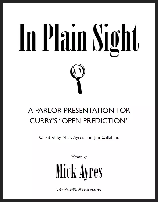 Discover In Plain Sight, a groundbreaking collaboration between Mick Ayres and paranormalist Jim Callahan. This presentation not only solves Curry’s legendary challenge but also turns it into a mesmerizing performance that leaves audiences in awe. With no sleight-of-hand required, this effect is accessible to performers of all skill levels and can be repeated without losing its impact.